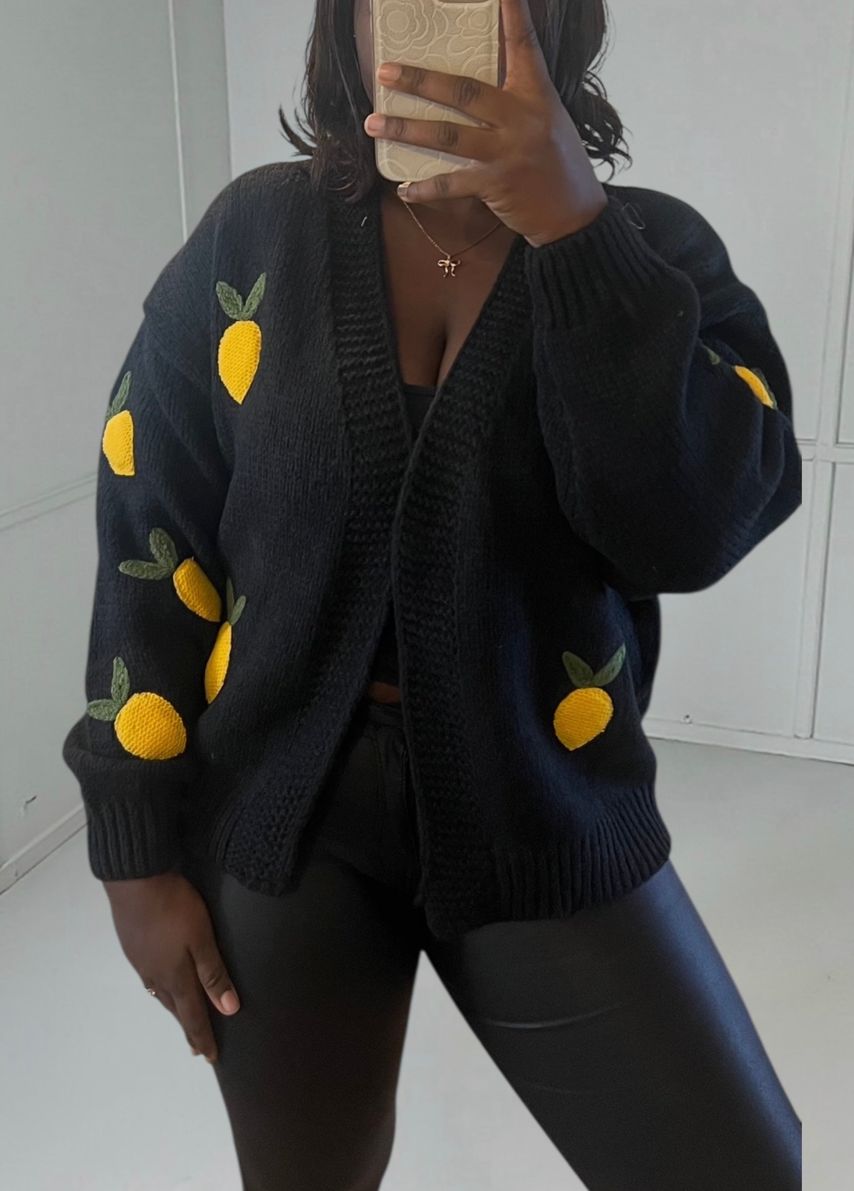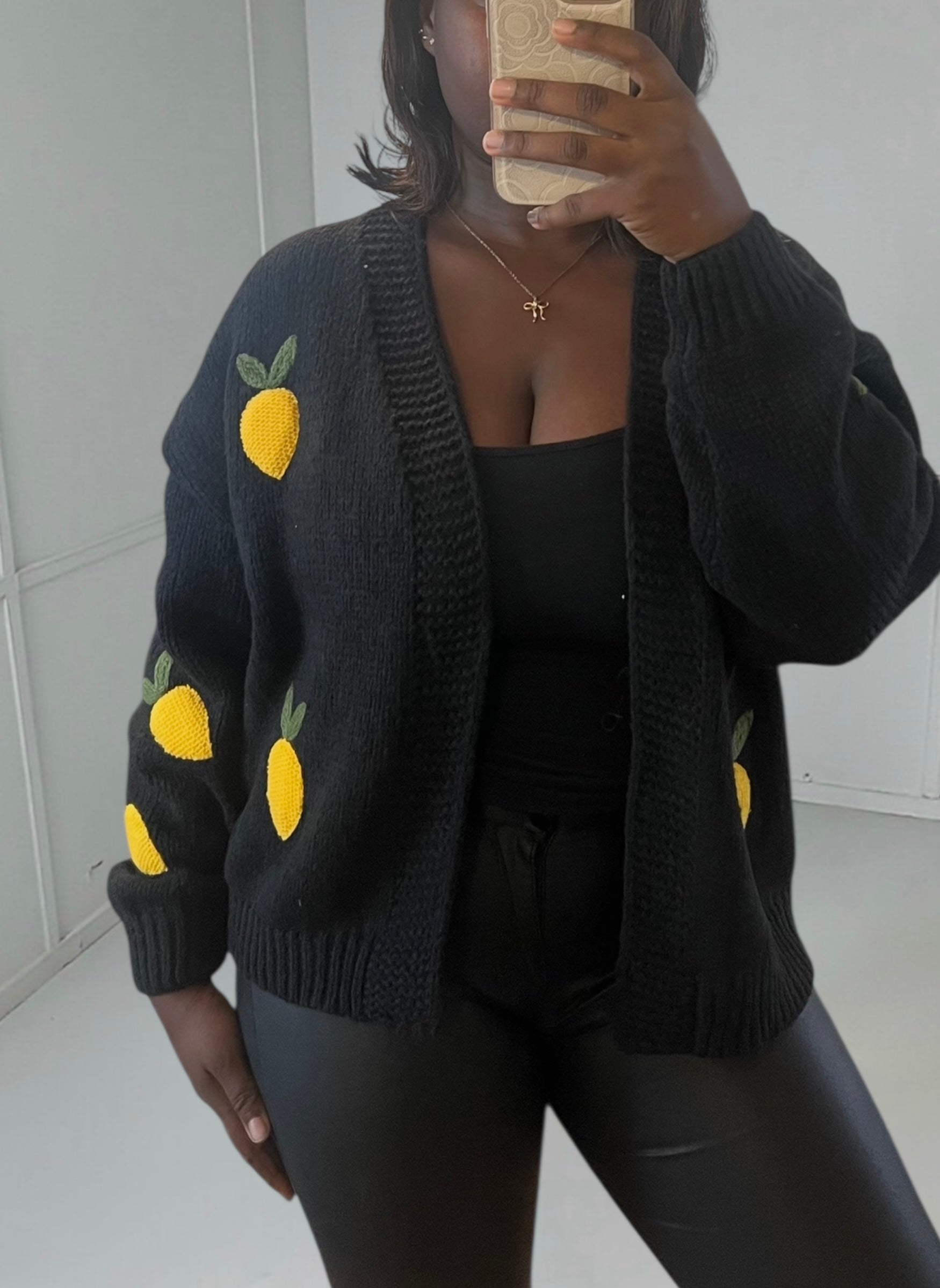 The CITRINE cardigan embodies the joy of life with its vibrant lemon motif. Fresh and bright, it adds a touch of pep and cheer to all your looks, evoking sunny days and good moods.