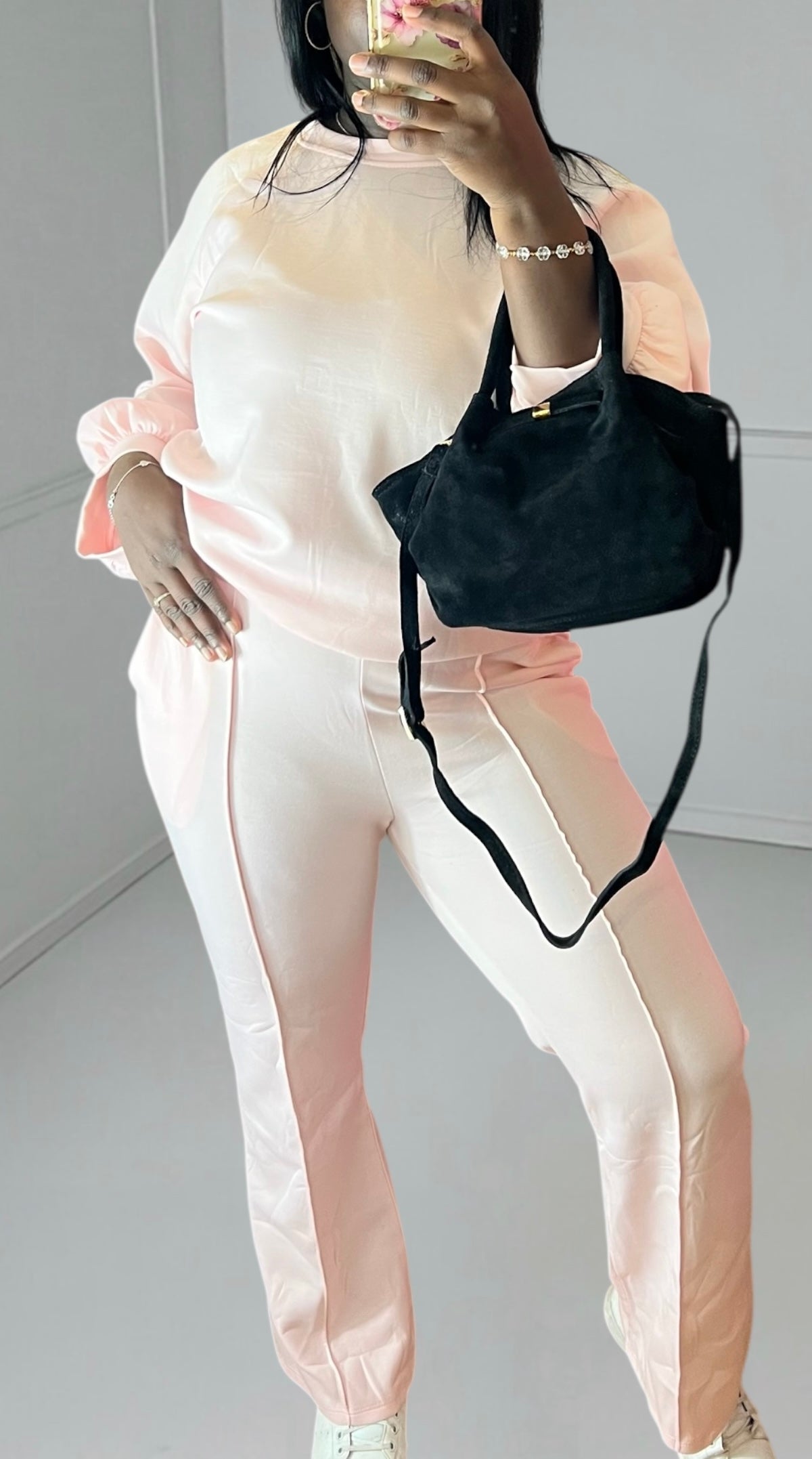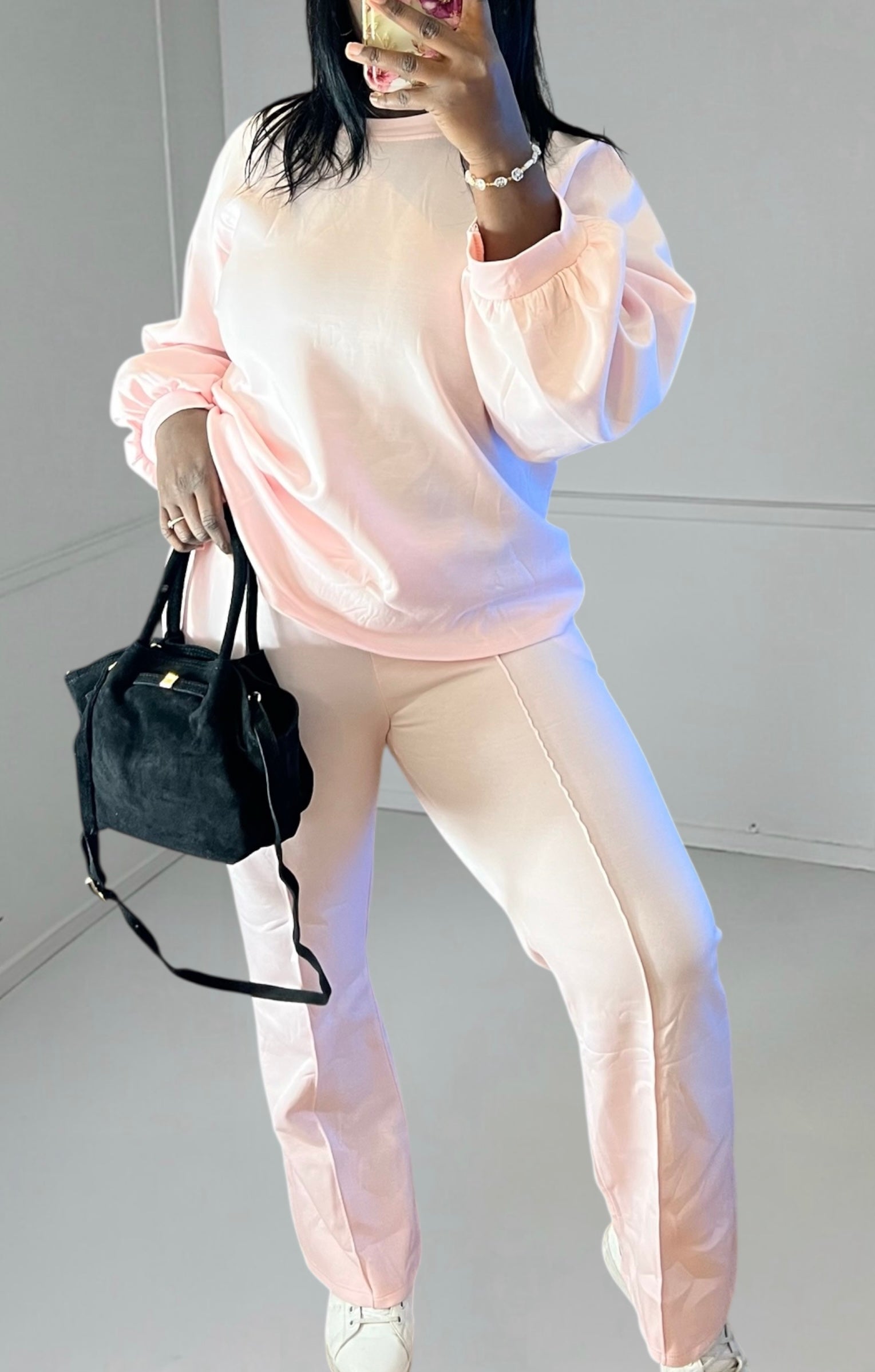 This powder pink ensemble, consisting of an oversized sweatshirt and wide-leg trousers, is the very definition of casual chic. Its soft color and comfortable fabric will keep you stylish from morning to night.
