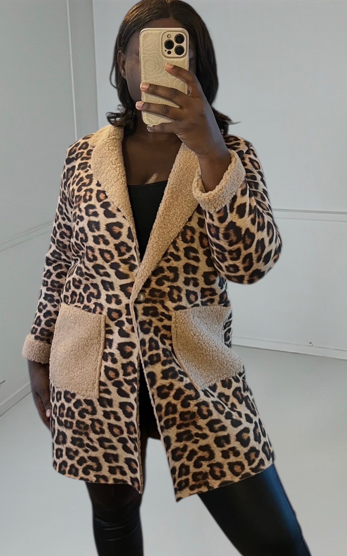 This leopard-print coat embodies boldness and sophistication. Its iconic pattern and elegant cut make it a statement piece that instantly transforms any look.